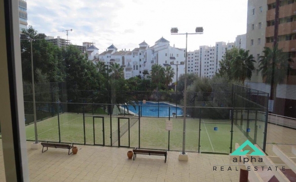 Amplio apartamento con 3 dormitorios y 2 baños, bonita terraza, con plaza de parking, piscina comunitaria, jardín y pista de tenis a poca distancia a pie de la playa.